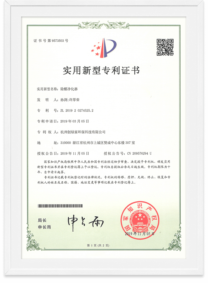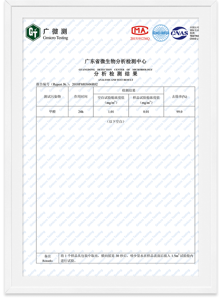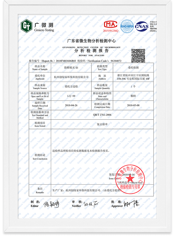 除醛精靈甲醛去除率檢測報告